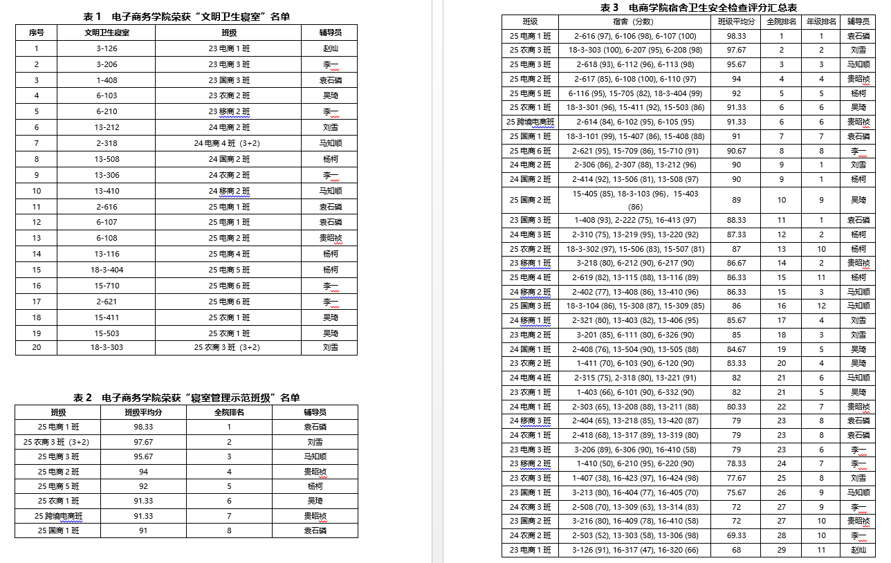 1. 授予8个班级“寝室管理示范班级”称号(每小组得分最高的两间宿舍)、20个宿舍“文明卫生寝室”称号(班级平均分排名前8名),颁发荣誉奖状予以全院表彰(具体名单见附件);