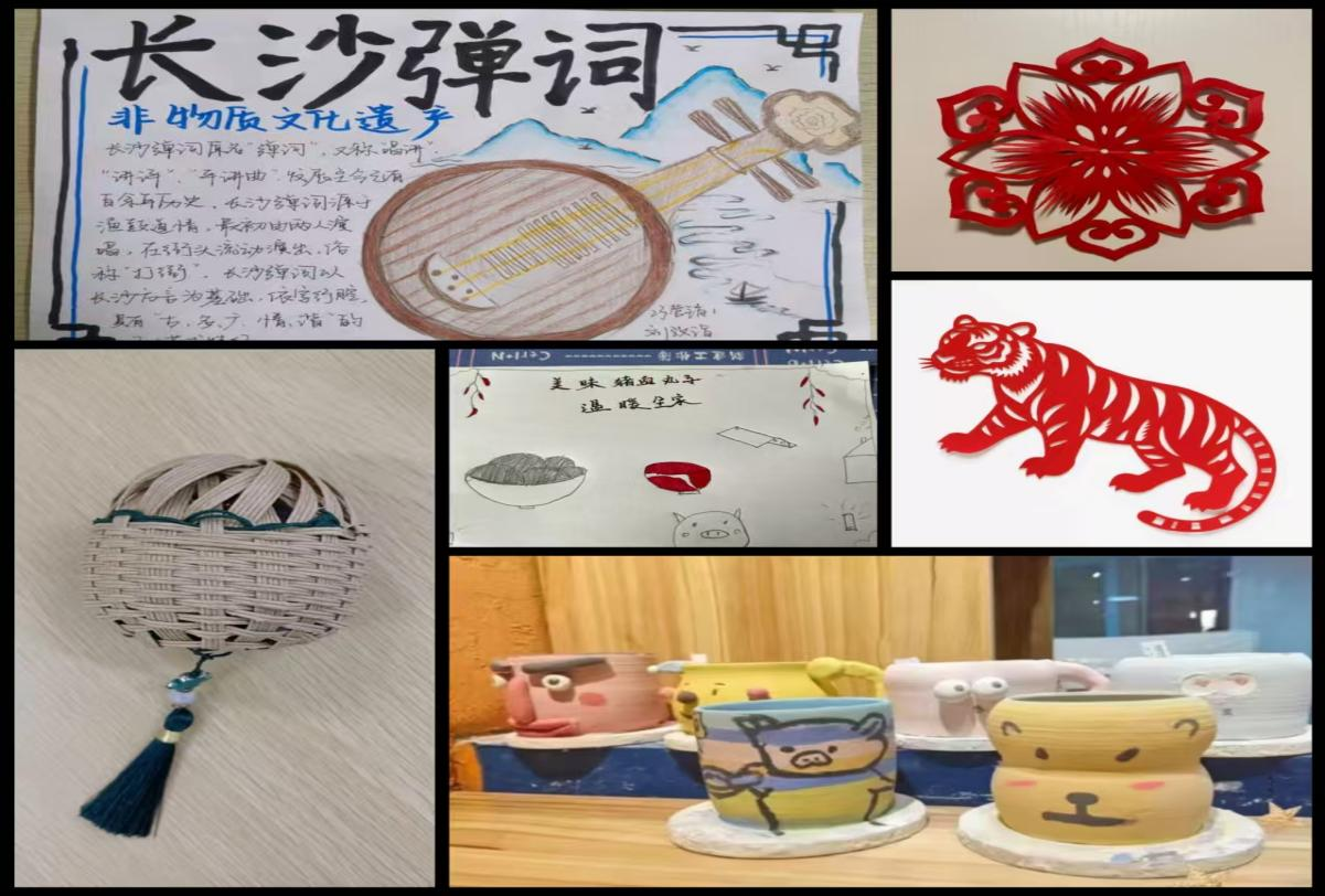 在制作家乡非遗文化作品的环节,各位志愿者同学通过手抄报、剪纸、竹编、陶艺等多种形式展示了家乡的非遗文化,每一件作品都是对文化传承最好的诠释。
