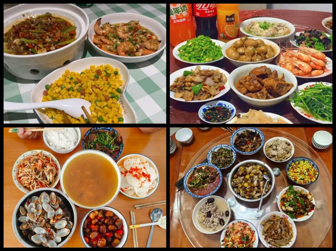 在“分享团圆饭”的环节,佳肴分享成为了活动的“暖心窗口”。在同学们的分享中,既有家人围坐、满桌佳肴的温馨盛景——油亮的大虾、鲜绿的时蔬、冒着热气的汤羹,氤氲着烟火气的团圆;也有同学独自在外,精心准备的“一人食团圆饭”——一碗素面、一碟小菜,虽简单却盛满对家的想念。“镜头里的团圆,隔着屏幕也暖,”24级物流管理2班曹惠杭同学在心得中感慨,“原来‘团圆’不止是相聚,更是心里装着彼此的牵挂。”这些照片不仅传递了中秋的温暖氛围,更让天各一方的彼此在分享中拉近了距离。