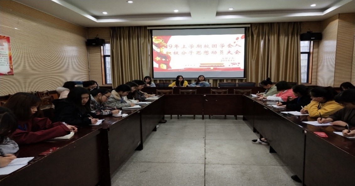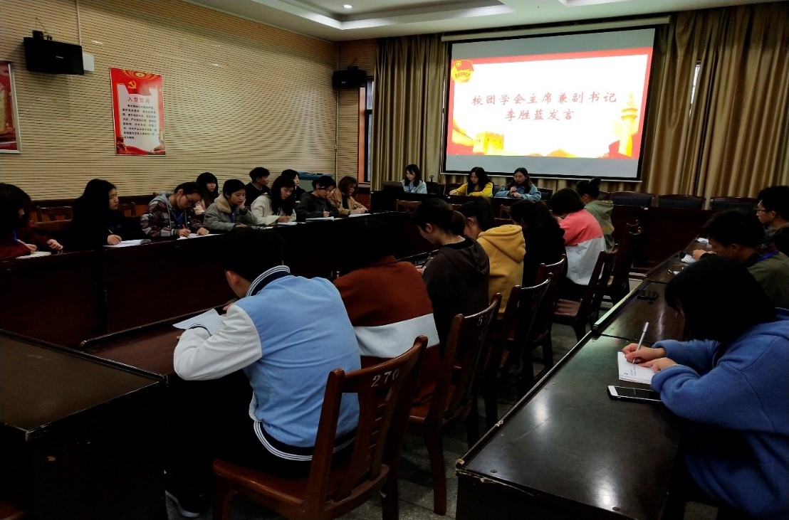 本网讯(通讯员:校组织部吴嘉蕾)为培养一支有信念、有激情、有朝气的学生干部队伍,充分激发学生干部的理想主义情怀,把服务同学、提升自我的宗旨牢记于心,外化于行,感染更多的同学坚定不移听党话,跟党走。在学工处、校团委的指导下,校团学会于2019年4月3日晚上在办公楼第五会议室组织召开了2019年上学期校团学会学生干部入党积极分子共20余人的座谈会。校团学会副书记石可馨,校团学会主席兼副书记李胜蓝,校组织部部长陈婷婷以及校团学会所有入党积极分子成员参加了会议,会议由校团学会组织部陈婷婷担任主持。