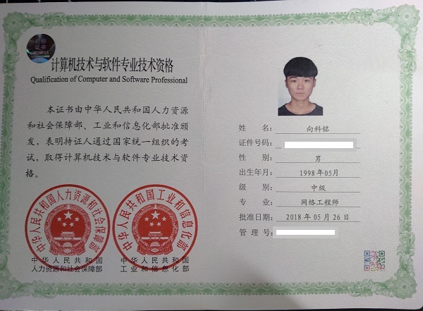 近日,我院16级计网班唐粤、陈榕、向科铭、曹岗、李玉红、王海棠等6名同学通过计算机技术与软件专业技术资格(水平)考试,获得由中华人民共和国人力资源和社会保障部、工业和信息化部批准颁发的“网络工程师”证书(级别:中级)。