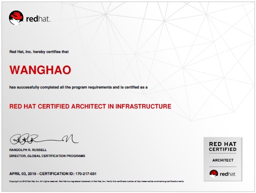 近日,我院计算机网络技术专业王浩同学努力学习,奋勇拼搏,顺利通过红帽OpenShift、虚拟化、安全、集群、调优等5门RHCA考试,荣获RHCA红帽认证架构师证书。