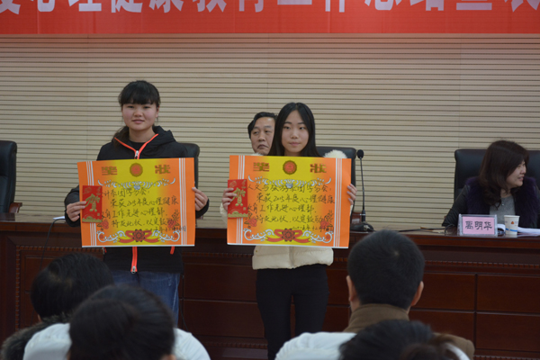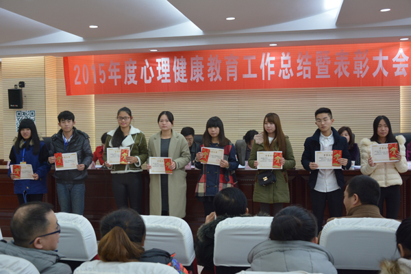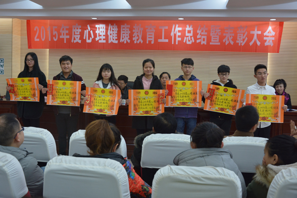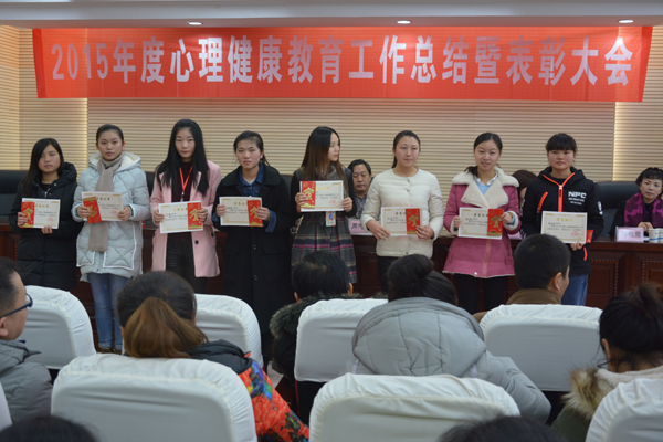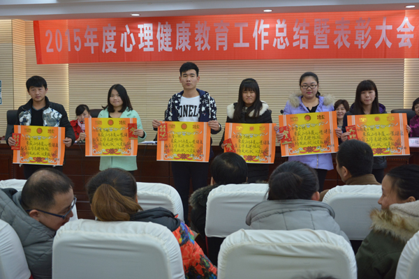 党委委员禹明华宣读了学院关于表彰2015年度学生心理健康教育工作先进集体和先进个人的文件:人文与旅游系团学分会心理部、会计系团学分会心理部获得先进心理部;14会计1班、14会计5班、14计网班、15市营4班等13个班级获得先进班级体;经济贸易系骆清、人文与旅游系吴丹、会计系唐紫莹等7位老师获得先进工作者称号;14文秘班黎航、14财管3班曹文娟、15连锁1班陈芳、15会计2班李莎莎等16名学生获得优秀学生骨干;14会计5班唐慧敏、14市营6班曹淑倩、14市营6班贺光方获得奉献奖。现场,学院领导为获奖者颁发奖状、证书及奖金。