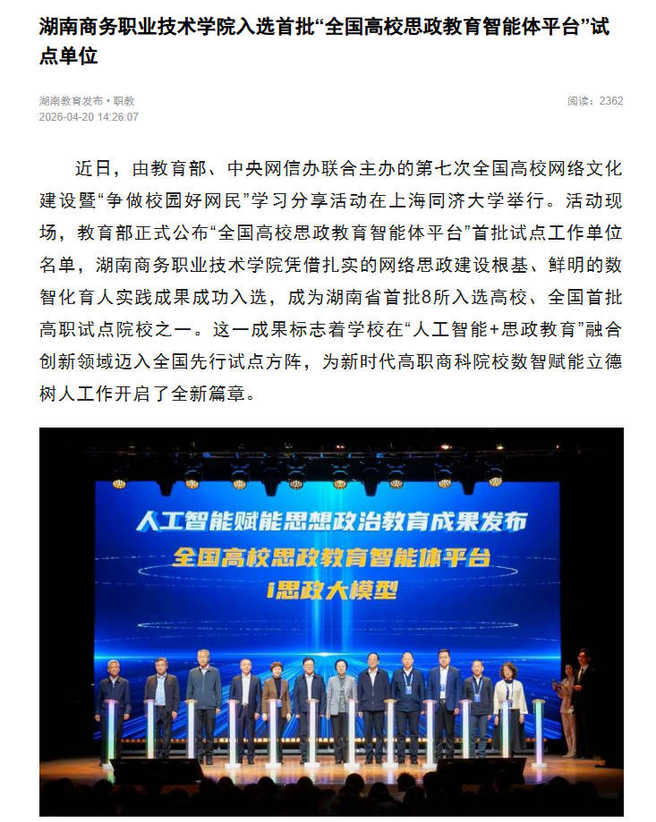 湖南教育发布报道——湖南商务职业技术学院入选首批“全国高校思政教育智能体平台”试点单位