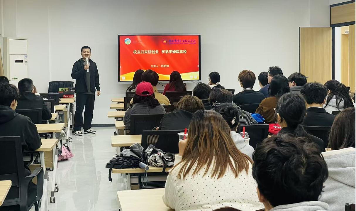 这不是什么网红见面会,而是学校“校友归来讲创业 学弟学妹取真经”活动的现场。当前,“校友回湘”热潮正浓,学校邀请从本校“湘商创业园”走出的创业“新生代”——2000年出生的陈煜博,回母校给50余名创业学弟学妹分享他的“开挂”人生。