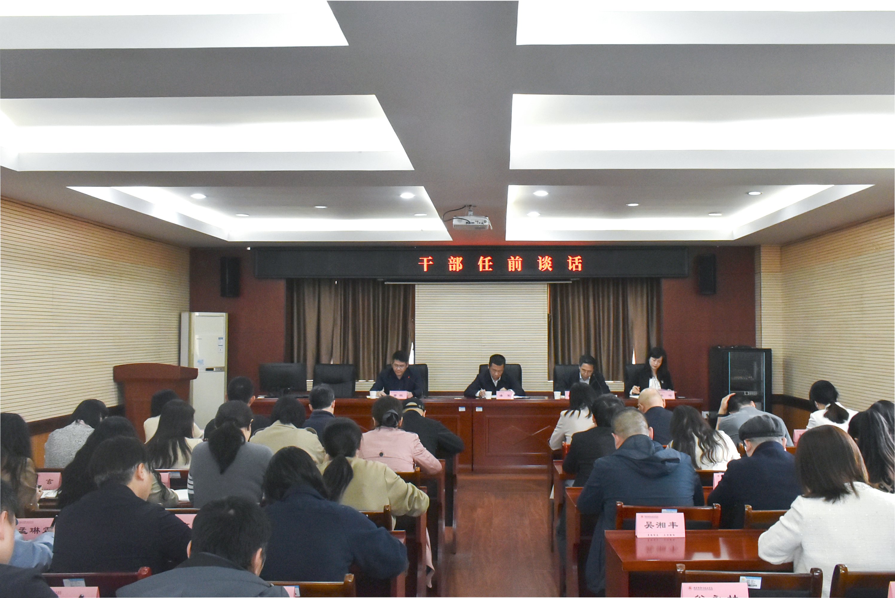 4月14日,学校召开干部任前集体谈话会。学校党委书记潘军,党委委员、纪委书记黄栋出席会议并讲话,党委副书记桂诚主持会议,组织部常务副部长李琦宣布干部任免决定,全体新提拔干部和中层副职干部参加会议。